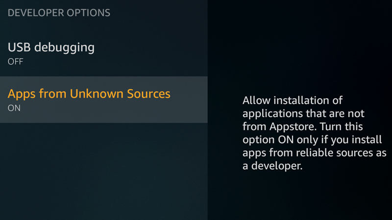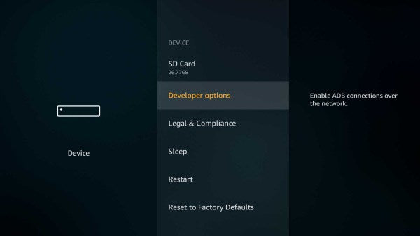 *NEWER FIRESTICKS HAVE DEV OPTIONS HIDDEN. WHILE IN MY FIRE TV PRESS SELECT 7 TIMES. THEN PRESS THEBACK BUTTON ONE TIMEANDSELECT ONE TIME. DEV OPTIONS SHOULD BE AVAILABLE ONCE COMPLETED.